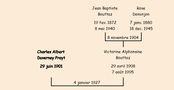 Epoux : Charles Albert Duverney Pret (25 ans, né à Villarembert le 29 juin1901, domicilié à Villarembert au hameau des Cours, forgeron), fils de Pierre Joseph et de Sophie Roche |