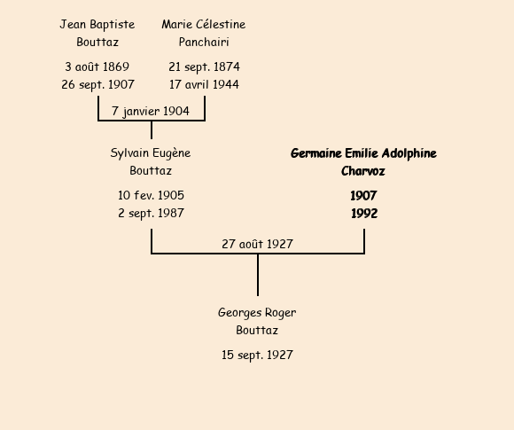 Epouse : Germaine Emile Adolphine Charvoz (20 ans, née à Saint Michel de Maurienne le 10 février1907, domiciliée à La Bise, institutrice), fille de Vincent Sixte ( domicilié à Saint Georges d'Hurtières, garde des Eaux et Forêts) et de Marie Rosalie Bertrand |