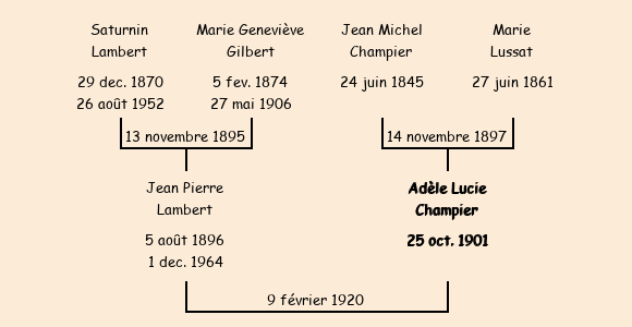 Epouse : Adèle Lucie Champier (18 ans, née à Saint Pancrace le 24 octobre1901, de Saint Pancrace), fille de feu Jean Michel et de Marie Lussat (domiciliée à Saint Pancrace) |