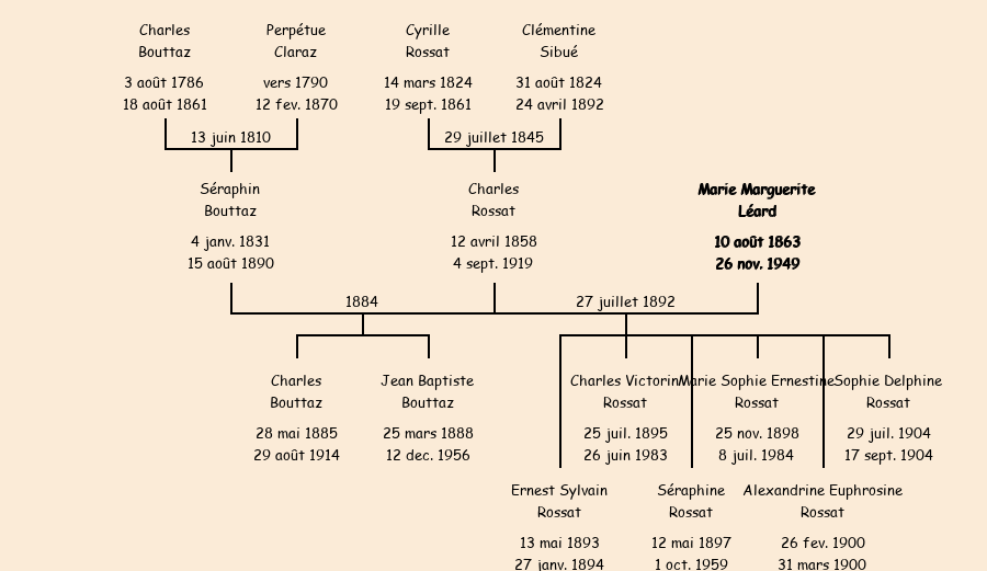 Epouse : Marie Marguerite Léard (29 ans, née à Jarrier le 10 août1863, de Pierre Pin, cultivatrice, veuve de Séraphin Bouttaz décédé à Saint Jean le 15 août1890, a signé), fille de Etienne (cultivateur à Jarrier, n'a pas su signer) et de Jeanne Marie Flammier (cultivatrice, n'a pas su signer) |