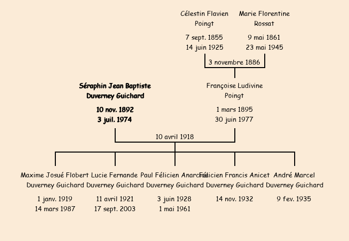 Epouse : Françoise Ludivine Poingt (née le 1er mars01895, de Charvin), fille de Célestin Flavien (de Charvin, excusé ayant donné son consentement le 6 avril courrant) et de Marie Florentine Rossat (de Charvin) |