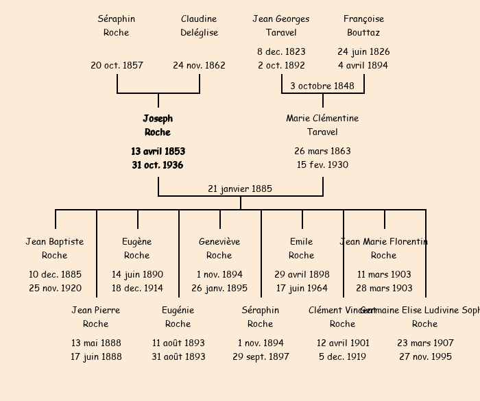Epoux : Joseph Roche (32 ans, né le 13 avril1853 à Villarembert, cultivateur domicilié à Villarembert, n'a pas su signer), fils de Séraphin (cultivateur, décédé à Villarembert le 20 octobre857) et de Claudine Deléglise (décédée à Villarembert le 24 novembre1862) |