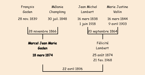 Epoux : Marcel Jean Marie Gaden (22 ans, né à Jarrier le 18 mars1874, cultivateur, domicilié à Saint Pancrace, a signé), fils de François (cultivateur à Saint Pancrace, a signé) et de Mélanie Champlong (cultivatrice, a signé) |