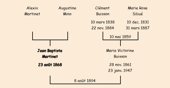 Epouse : Marie Victoine Buisson (33 ans, née le 28 novembre1861, de L'Alpettaz, cultivatrice, a signé), fille de Clément (décédé à L'Alpettaz le 22 novembre1884) et de Marie Rose Sibué (décédée à L'Alpettaz le 31 mars1887) |