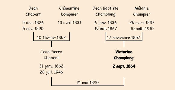 Epouse : Victorine Champlong (26 ans, née à Saint Pancrace le 2 septembre1864, cultivatrice à Saint Pancrace, a signé), fille de Jean Baptiste (décédé à Fontcouverte le 19 octobre1867, de son vivant cultivateur à Saint Pancrace) et de Mélanie Champier (cultivatrice à Saint Pancrace, n'a pas su signer) |
