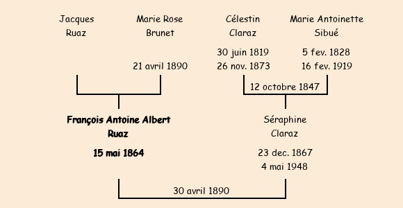 Epoux : François Antoine Albert Ruaz (26 ans, né à Saint Sorlin d'Arves le 15 mai1864, domicilié à Saint Jean, négociant, a signé), fils de Jacques (cultivateur domicilié à Saint Sorlin d'Arves, n' a pas signé) et de Marie Rose Brunet (décédée à Saint Sorlin d'Arves le 21 avril1890) |
