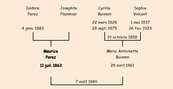 Epoux : Maurice Paraz (26 ans, né au hameau de Vers Le Rieux le 11 juillet1863, cultivateur à Jarrier, a signé), fils de Isidore (décédé à Jarrier le 4 janvier 1883) et de Josephte Flammier (cultivatrice, n'a pas su signer) |