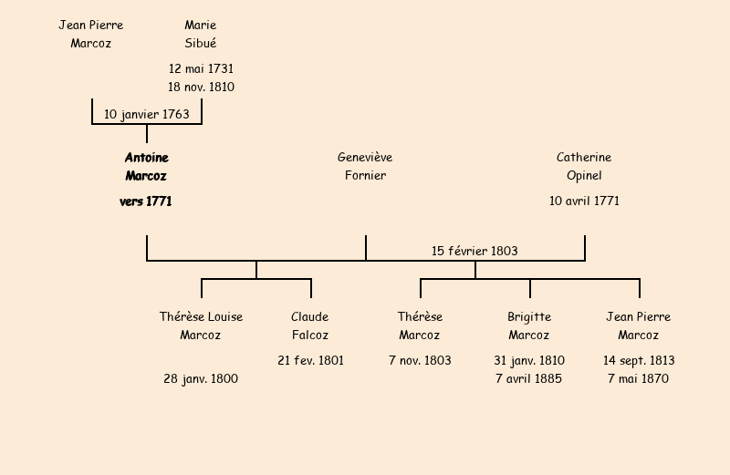 A son mariage de 1803 : 32 ans, habitant à Pierre Pain, fils de Jean Pierre et de Marie Sibué. Le mariage a lieu le 26 pluviose an dix (15 février 1802... mais dans archives de 1803). |