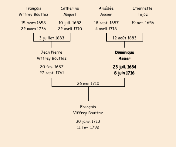 Mariée (25 ans) avec Jean Pierre Viffrey Bouttaz (23 ans) le 26 mai 1710 à Fontcouverte ![]() |