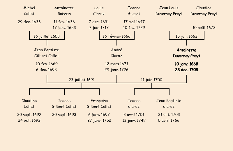 Epouse : Antoinette Duverney Preyt (de Villarembert, veuve de Jean Baptiste Collet fils de Michel de Fontcouverte), fille de feu Jean Louis |