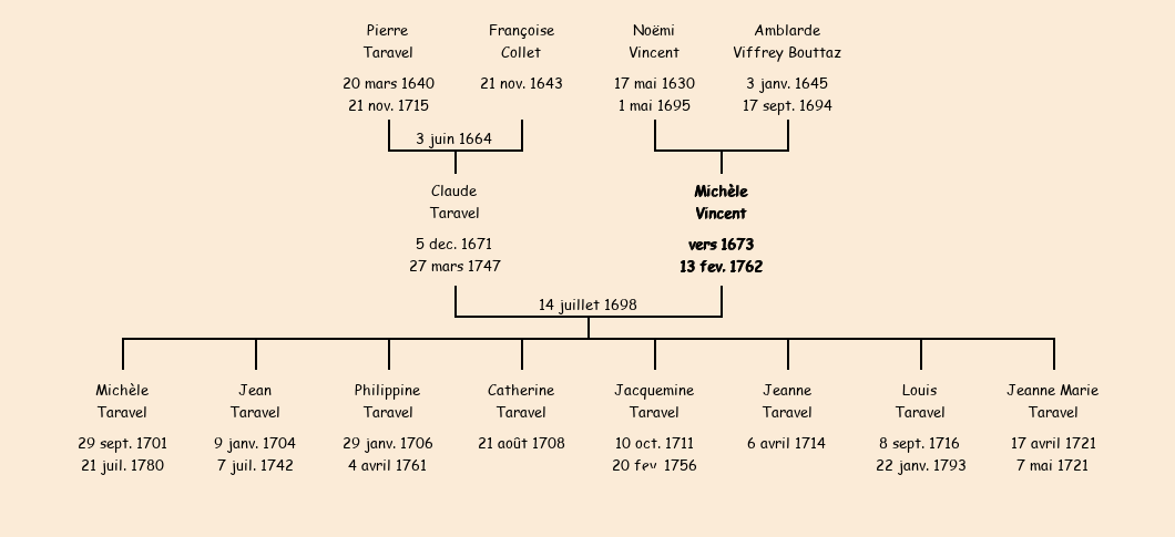 En tant qu'épouse de Claude Taravel, elle est fille de Noëmi (naissance non trouvée). Année de naissance calculée à partir de l'âge (43 ans) donné dans le recensement de 1716. |