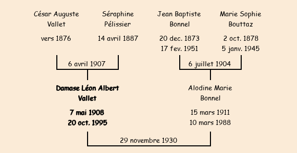 Epoux : Damase Léon Albert Valet (22 ans, né à Saint Jean de Maurienne le 7 mai1908, manoeuvre), fils de César Auguste (domicilié à Saint Jean de Maurienne, manoeuvre) et de Séraphine Pélissier |