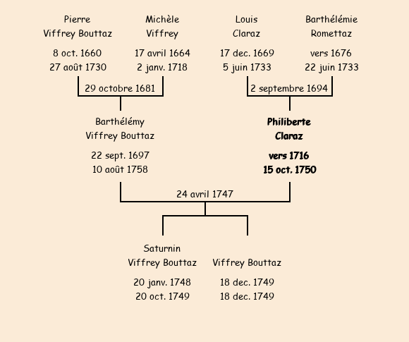 Mariée (31 ans) avec Barthélémy Viffrey Bouttaz (49 ans) le 24 avril 1747 à Fontcouverte ![]() |
