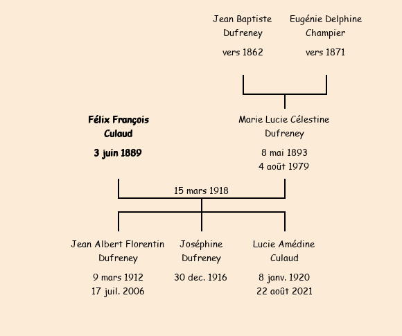 Epoux : Félix François Culaud (né à Corsier, canton de Genève (Suisse), présentement militaire au 158ème régiment d'infanterie, 25ème compagnie en détachement au 159ème régiment d'infanterie, matricule 05066A à Valréas), fils de Pierre (originaire de Haute Savoie, commune de Draillant, décédé) et de Marie Odile Favrat (originaire de Haute Savoie commune d'Orcier, décédée) |