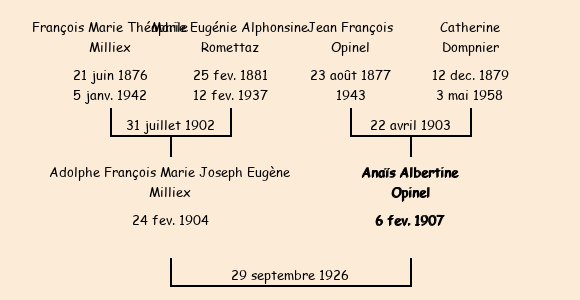 Epouse : Anaïs Albertine Opinel (19 ans, née à Albiez le Vieux le 6 février1907, domiciliée à Gévoudaz), fille de Jean (domicilié à Gévoudaz, taillandier) et de Catherine Dompnier |