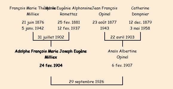 Epoux : Adolphe François Marie Joseph Eugène Milliex (22 ans, né à Saint Sorlin d'Arves le 24 février1904, domicilié à Charvin), fils de François Marie Théophile (de Charvin) et de Marie Eugénie Romettaz (de Charvin) |