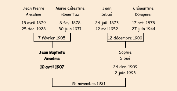 Epoux : Jean Baptiste Anselme (24 ans, né à Saint Jean de Maurienne le 10 avril1907, domicilié à Saint Jean de Maurienne rue de la Sous-Prefecture, charpentier), fils de feu Jean Pierre et de Marie Célestine Romettaz (domiciliée à Saint Jean de Maurienne rue de la Sous-Prefecture) |
