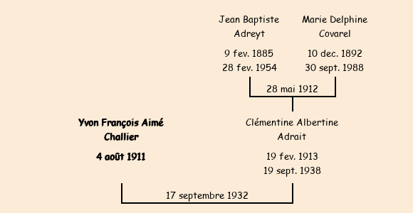 Epoux : Yvon François Aimé Challier (21 ans, né à Orelle (Savoie) le 404 août1911, domicilié à Orelle, résident à Bonneval canton de Moutiers (Savoie)), fils de Albert Joseph (domicilié à Orelle) et de Angeline Zénaïde Albert |