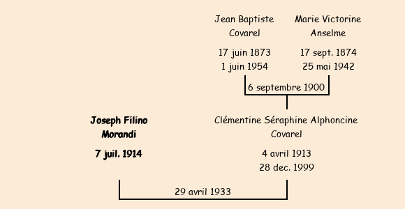 Epoux : Joseph Filino Morandi (18 ans, né à Lyon 6ème, le 7 juillet1914, domicilié à Saint Jean de Maurienne), fils de Henri (domicilié Grande rue à Saint Jean de Maurienne, peintre) et de Pauline Capucetti |