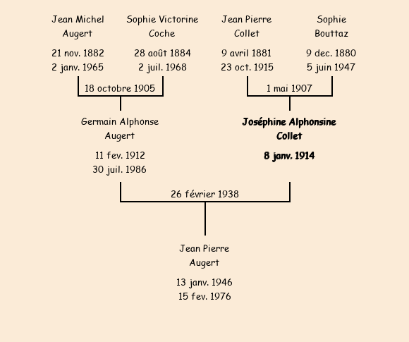 Epouse : Joséphine Alphonsine Collet (24 ans, née à Saint Pancrace le 8 janvier 1914), fille de feu Jean Pierre et de Sophie Bouttaz |