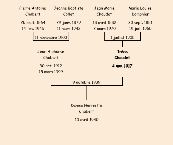 Epouse : Irène Chaudet (21 ans, née à Saint Jean de Maurienne le 4 novembre1917, domiciliée au Suel), fille de Jean Marie et de Marie Lucie Dompnier |