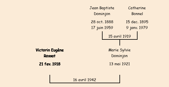 Epoux : Victorin Eugène Rossat (23 ans, né à Saint Jean de Maurienne le 21 février1918, domicilié à Saint Jean de Maurienne, chauffeur d'autos), fils de Victorine Rossat (domiciliée à Saint Jean de Maurienne) |
