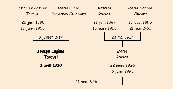 Epoux : Joseph Eugène Taravel (25 ans, né à Villarembert le 22 août1920, domicilié à Villarembert), fils de Charles Zozime et de Marie Lucie Duverney Guichard (domiciliés à Villarembert) |