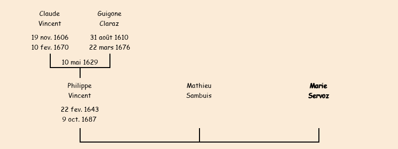 Mariée avec Mathieu Sambuis entre 1688 (date de décès de son précédent époux, Philippe Vincent) et 1691 (date à laquelle elle est marraine et épouse de Mathieu Sambuis). |