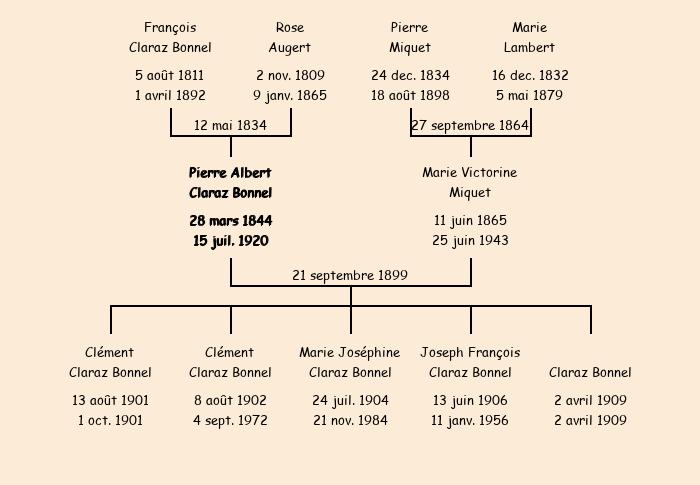 Epoux : Pierre Albert Claraz Bonnel (55 ans, né le 28 mars1844 à la Bize, cultivateur à La Bize, a signé), fils de François (décédé à La Bize le 1er avril1892) et de Rose Augert (décédée à La Bize le 9 janvier 1865) |