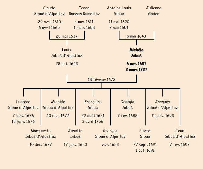 Mariée (20 ans) avec Louis Sibué d'Alpettaz (28 ans) le 18 février 1672 à Fontcouverte ![]() |